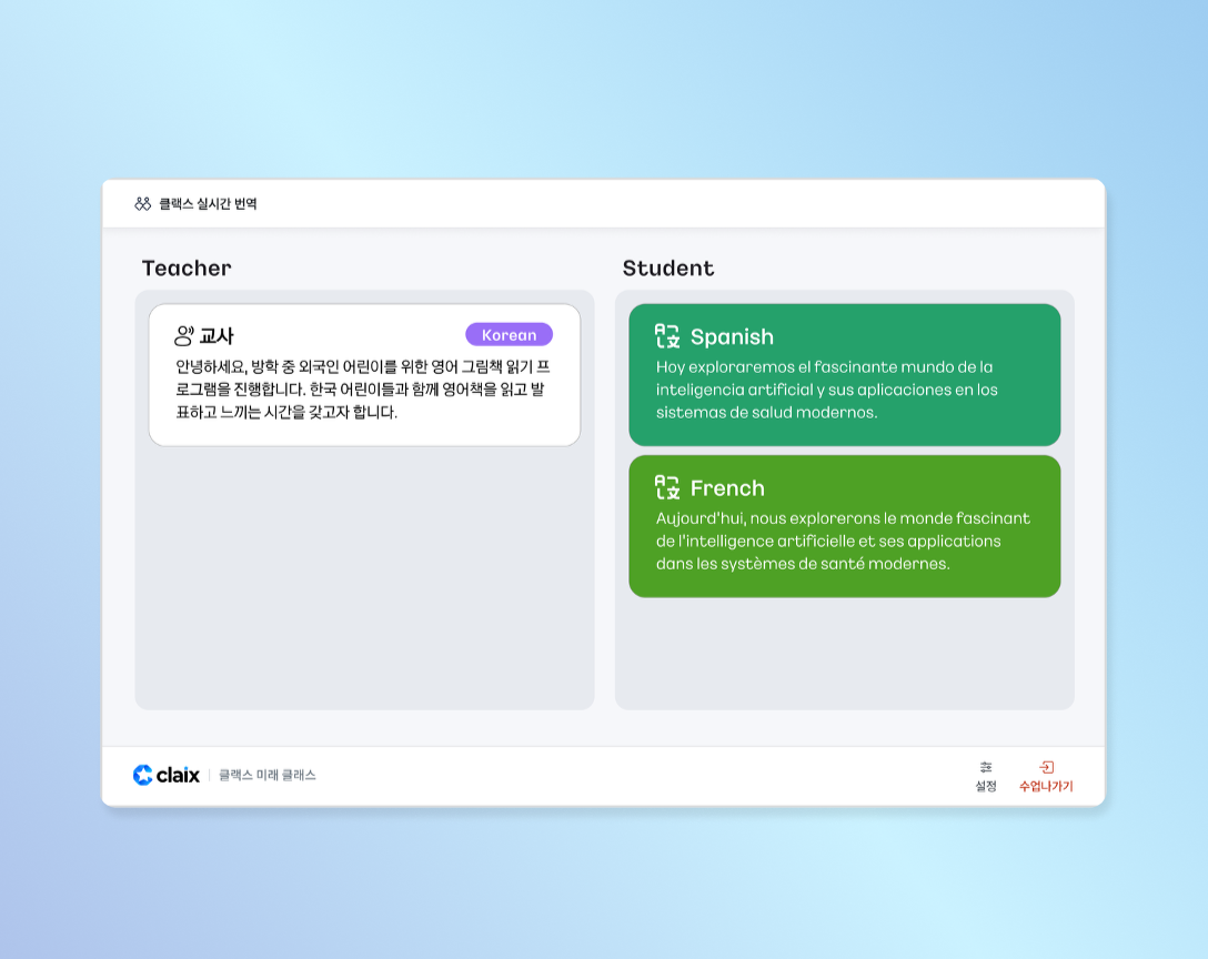 최대 3개 국어로 동시 번역해 주는 수업 환경을 제공합니다.